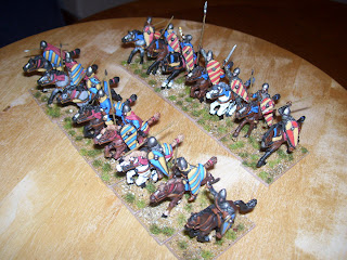 I worked up 15 Gripping Beast Spanish knights and jinetes, I like these figs. I went with a red/ochre/blue colour theme (very Spanish-looking) to represent liveried otherwise organized groups of Hidalgos. El Cid gaming is still a few units away, but in the meantime they will serve as two additional units of Norman knights in next week's Hail Caesar game